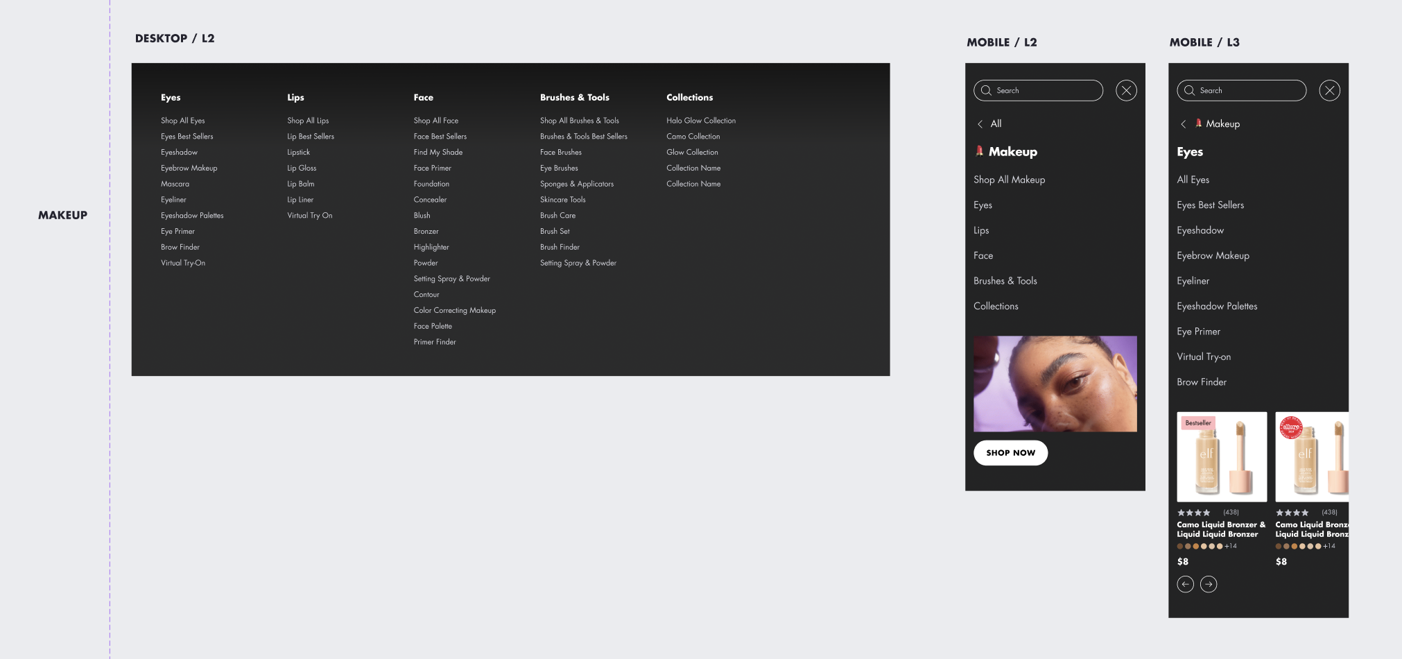 To better reflect e.l.f.’s bold, expressive brand voice, we reimagined the global navigation with a playful yet purposeful approach. By integrating emojis alongside category labels, we added a layer of personality that felt fun and scroll-stopping—without compromising clarity.